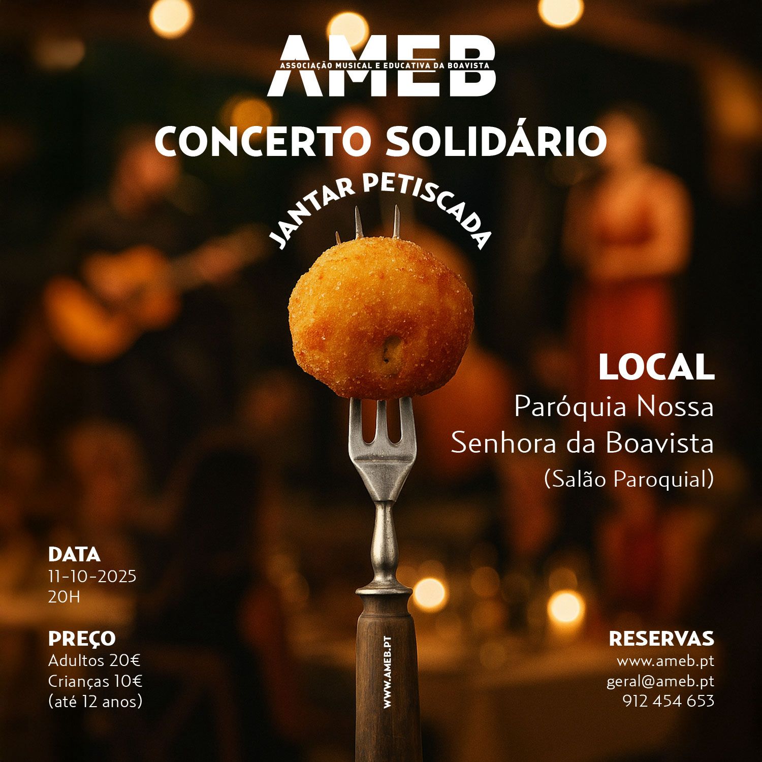 A AMEB – Associação Musical e Educativa da Boavista –, em parceria com a Paróquia de Nossa Senhora da Boavista, convida toda a comunidade a participar numa Noite Solidária, a realizar-se no próximo dia 11 de outubro de 2025, pelas 20h, no Salão Paroquial.